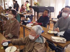 交流会では毎月第4木曜日に実施している誕生日会のケーキと喫茶の飲み物を召し上がって頂きました。