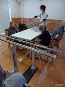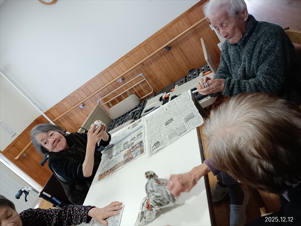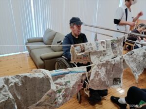 今日の優・悠・邑 和合 2025.12.13 「集団リハビリ」 今日は作業療法士による集団リハビリを行いました。 新聞紙丸める広げる干すという動作をどちらのチームが早くできるかを競いました。 皆さんで協力しながら楽しくリハビリに取り組まれる姿が見られました。