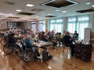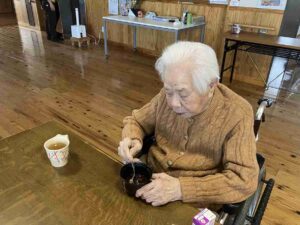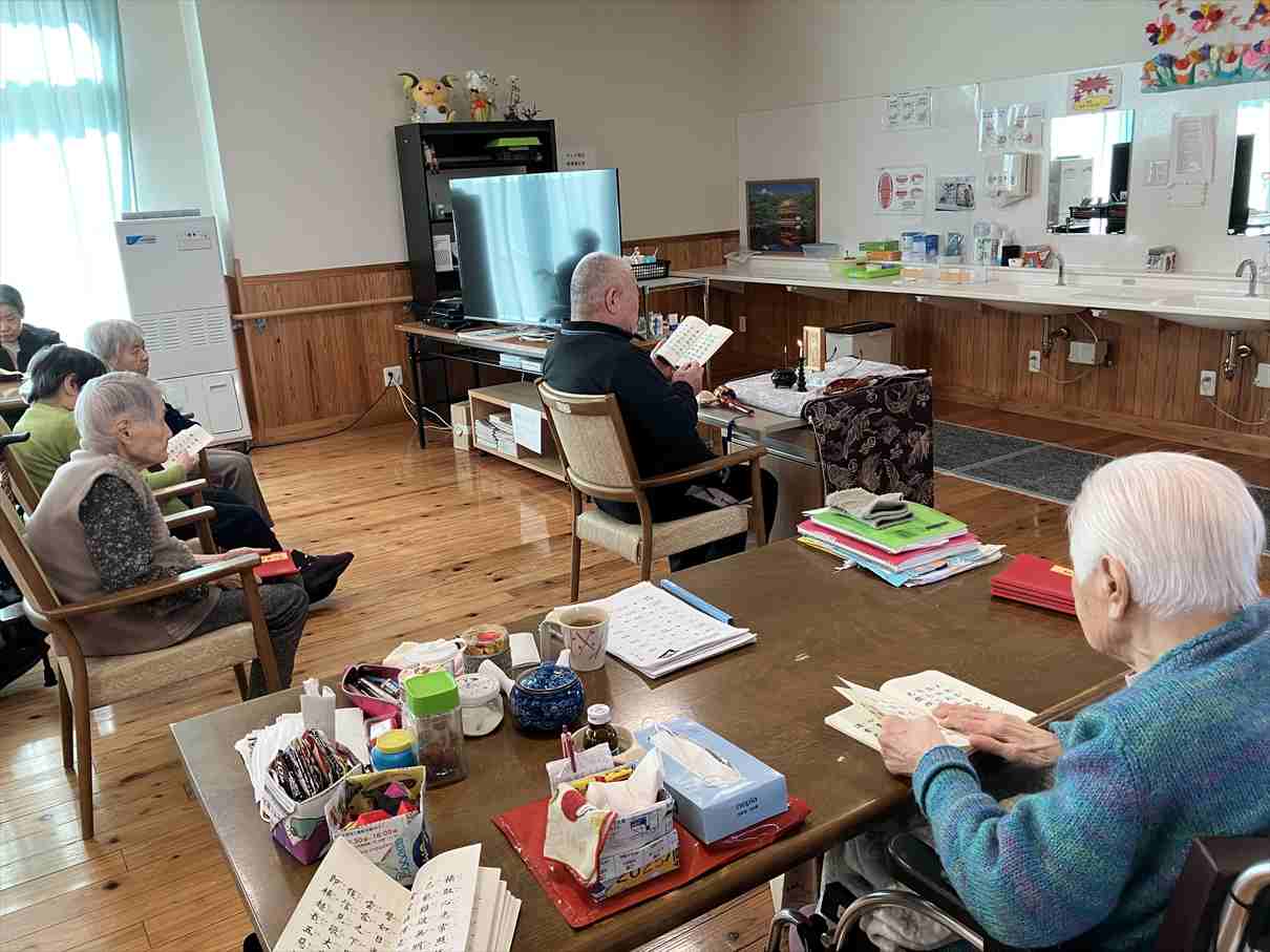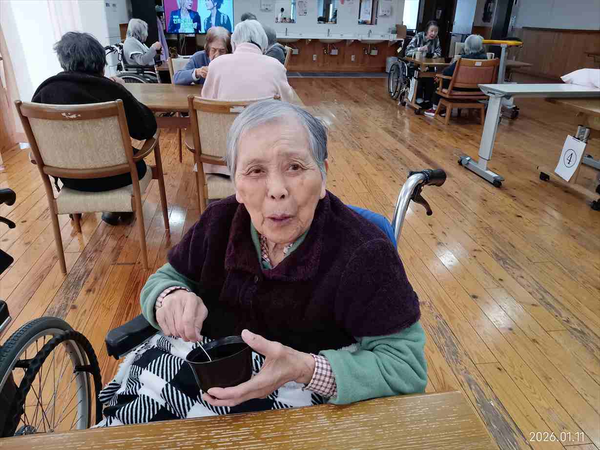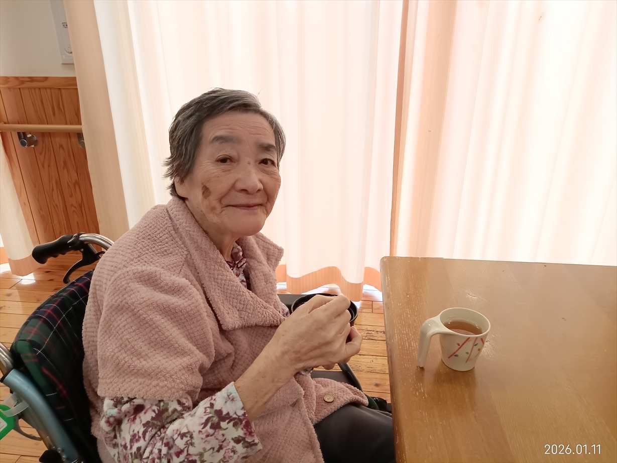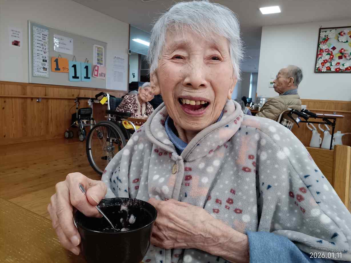 今日の優・悠・邑 和合 2026.1.11 お参りと鏡開き 今日の午前中は晴れて暖かかったですが、昼から少しずつ気温が下がり、雪もチラついてきました。 午前中、3階でお参りを行いました。 理事長と利用者様が一緒にお経を詠みました。 お参りの後は、理事長がいろいろなお話をしてくださいました。 とても穏やかな雰囲気でした。 午後は鏡開きを行いました。 餅ゼリーの入ったぜんざいを召し上がっていただきました。 「ごちそうさまでした。美味しかったです。」 「鏡開き、懐かしいです」 甘い物を食べて素敵な笑顔を見せてくださいました。