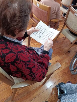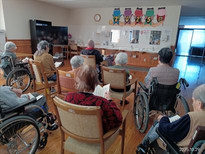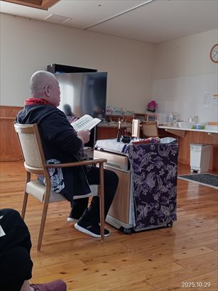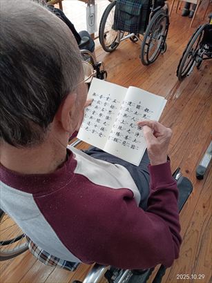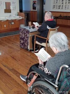 今日の優・悠・邑 和合 2025.10.29 お参り 本日、理事長お参りがありました。 皆様、経本を見ながら一生懸命お経を唱えていました。 寒くなってきましたが、お経を唱えれたし、体が温かくなったと喜ばれていました。