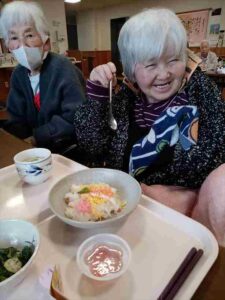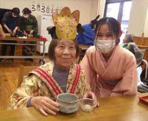 今日の優・悠・邑 和合 2026.3.3 お雛祭りお茶会 今日は3月3日桃の節句です。 お昼ご飯はちらし寿司と菜の花の和え物、桜のゼリーで、 とても美味しく皆さん大満足されていました。 午後からはひな祭りのお茶会がありました。 利用者様がかわいいお雛様になって下さいました。 やっぱり、女性の方はいつまでも可愛くなるのが大好きですね! 職員の着物姿がとってもかわいいと利用者様方が喜んでくださいました。