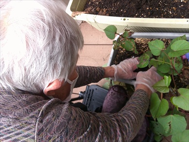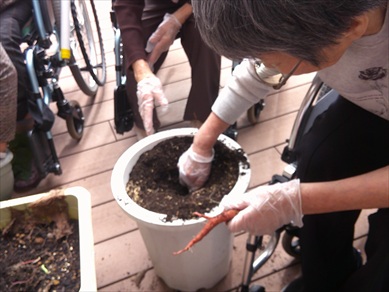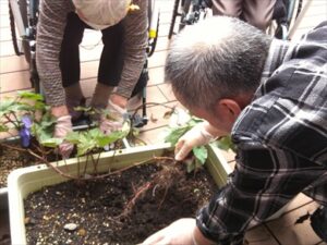 今日の優・悠・邑 和合 2025.10.20 さつま芋掘り プランターで育てていたさつま芋掘りを行いました。 「できているかなナ―。」「大きいイモが採れるといいナ。」 イモのつるをひっぱると、なんとかわいいさつま芋でしょうか。 数は沢山採れたのですが、小さいイモばかり。 暑さに負けたのか、栄養が足りていなかったのか、昨年より 小ぶりでしたが、皆さん芋掘りを楽しくされました。 秋の風が心地よく、久しぶりの外での作業に笑顔が見られました。 リフレッシュできましたでしょうか。