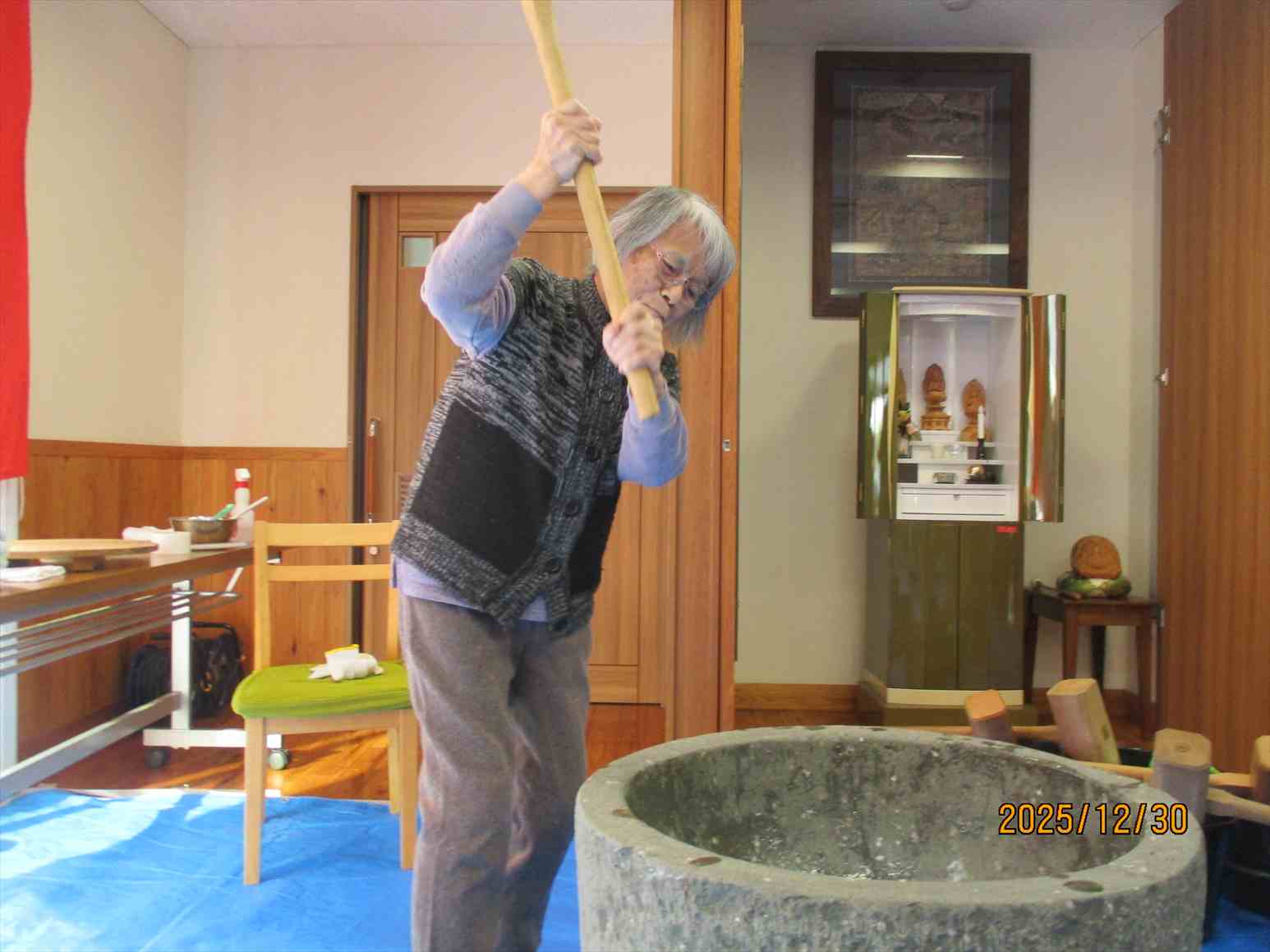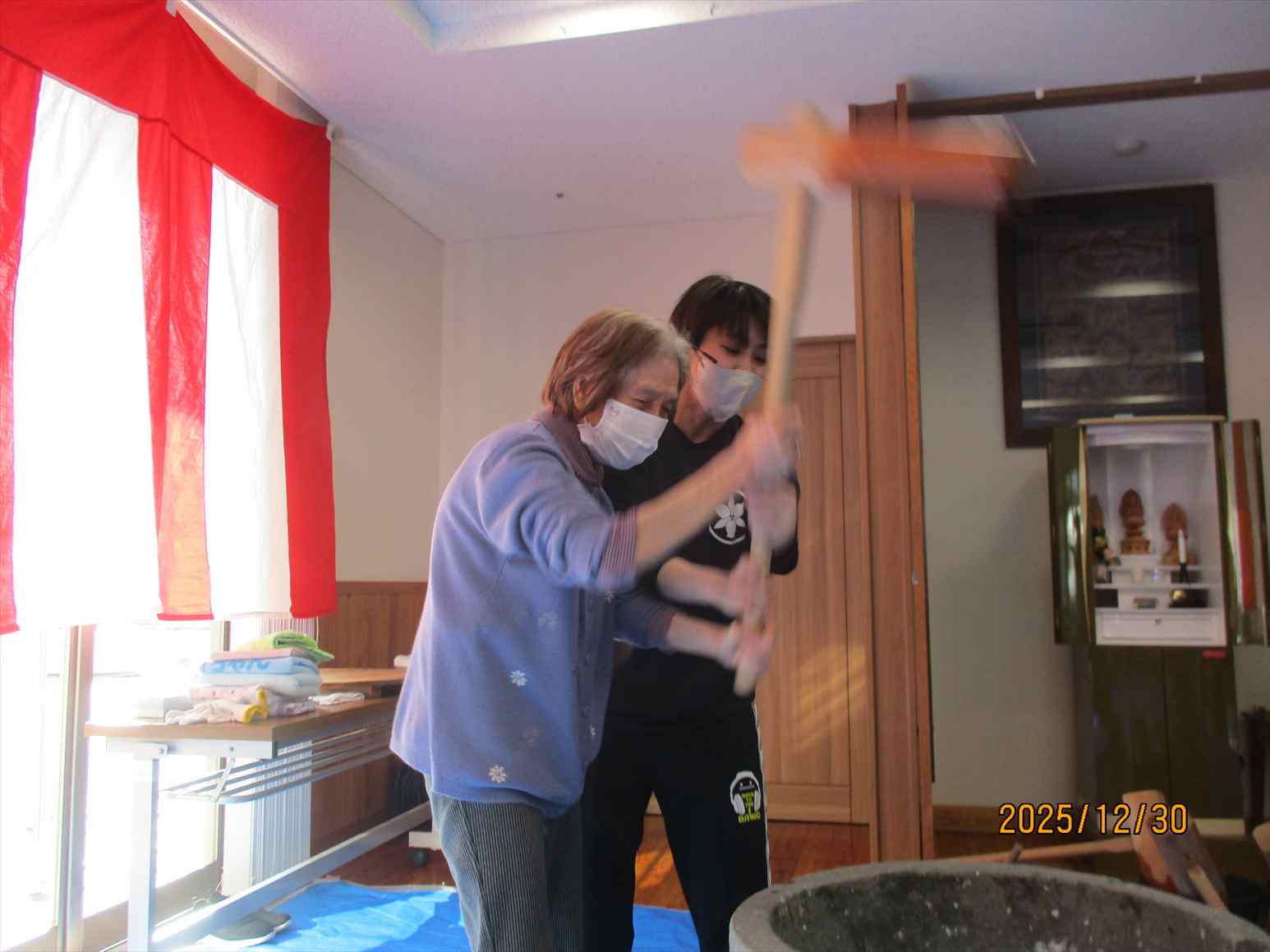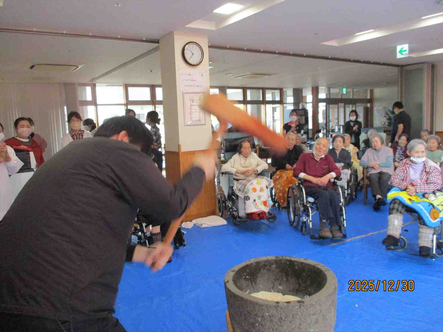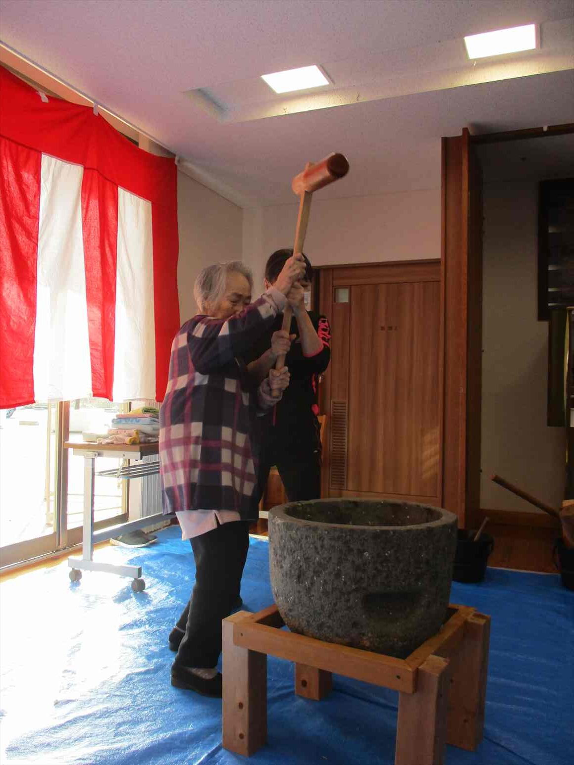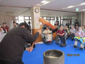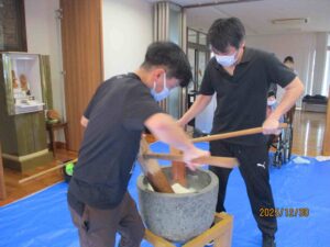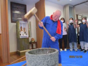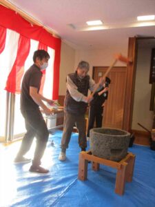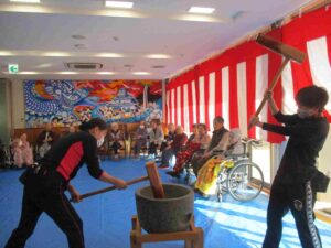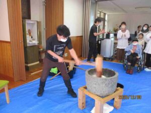 「よいしょ!よいしょ!」の掛け声に利用者様と職員が頑張って杵を振り上げ力いっぱいつきました。