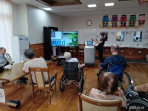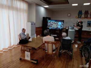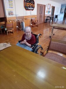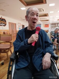 今日の優・悠・邑 和合 2025.10.8 カラオケ 外は、秋晴れの天気です。 施設内では、皆様、カラオケに夢中でした。 大きな声で、笑顔で、一生懸命歌ってみえました。 歌っていない方は、歌に合わせて楽しそうに手拍子をされていました。