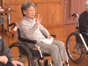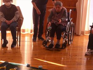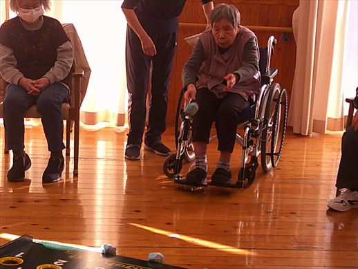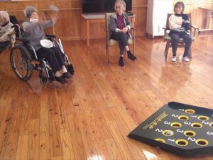 今日の優・悠・邑 和合 2025.12.6 スカットお手玉 本日のレクリエーションは「スカットお手玉」です。 いつもはスティックを使うのですが、今回は、お手玉を直接穴に投げ入れました。 いつもよりも簡単に見えますが集中力が必要で、なかなか穴に入りません。 お手玉なので、傾斜を転がりませんが、自分の番が3回にもなると高得点を取られる方が多く、後半の追い上げはとても歓声が上がりました。