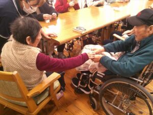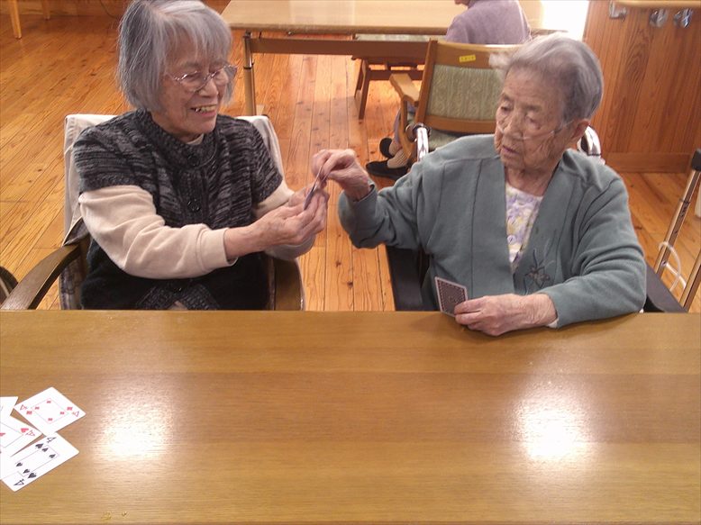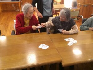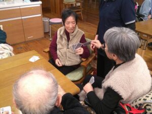 今日の優・悠・邑 和合 2026.1.13 トランプ「ババ抜き」 本日のレクレーションはトランプの「ババ抜き」です。 皆様、ババを相手にひかせるために戦略を考えて手札をもっています。 ババをひかれた時は「あ~」や「よし」など歓声があがります。 最初に上がられた方には皆様から拍手でお祝いされていました。 最後はババがいったりきたりで手に汗にぎる戦いでした。