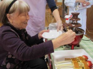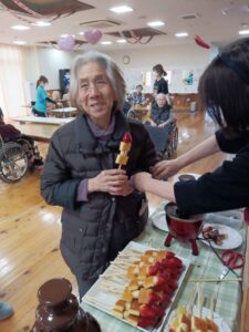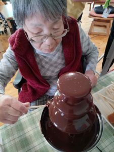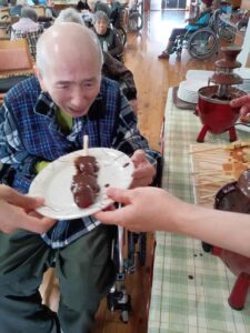 イチゴ、カステラ、バナナが並んだ串に流れるチョコレートをたっぷり付けて食べていただきました。「自分でするのが楽しい!わくわくする!」