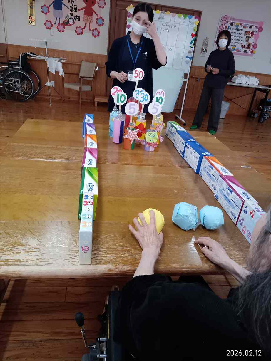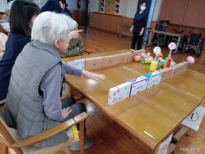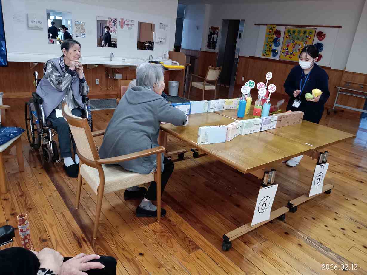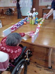 今日の優・悠・邑 和合 2026.2.12 ボーリング大会 今日は午後から看護実習生さん達と一緒にボーリング大会をしました。 ボーリングのピンやボール、レーンは看護実習生さんが何日もかけて作ってくださいました。 カラフルなピンやレーンが並び、とても華やかでした。 利用者の皆さんは歓声をあげて喜び楽しまれていました。