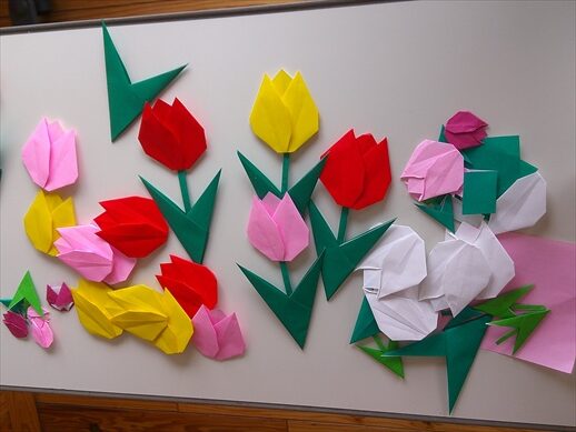 まずは折り紙でチューリップを作り、その後でコスモスの花を取り外し、
