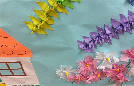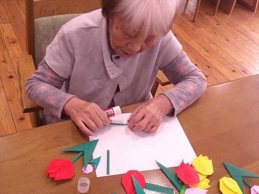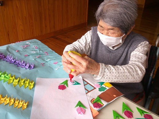 大きなサイズの花や茎、葉は利用者さまが、小さいサイズは職員が折りました。