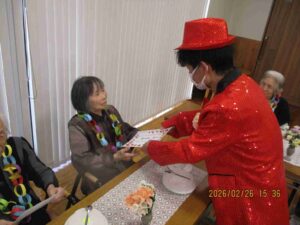 「代表して私が、職員さんにお礼の言葉を言いたい。」と利用者様から「職員さんも体に気をつけて元気でいて下さいね。家でもしてもらえんことをして下さるのでありがたい。感謝しています。これからもみんなで元気で仲良くやっていけるのが幸せです。」と素敵なお言葉をいただきました。