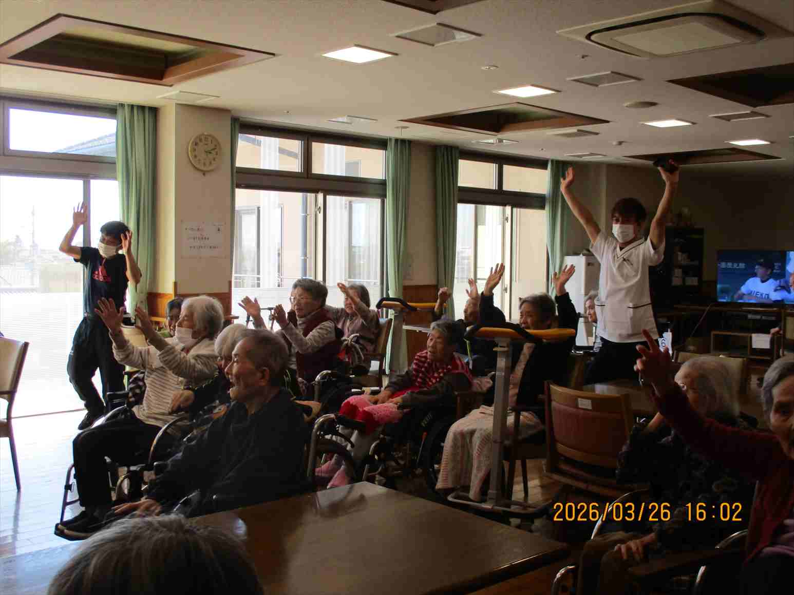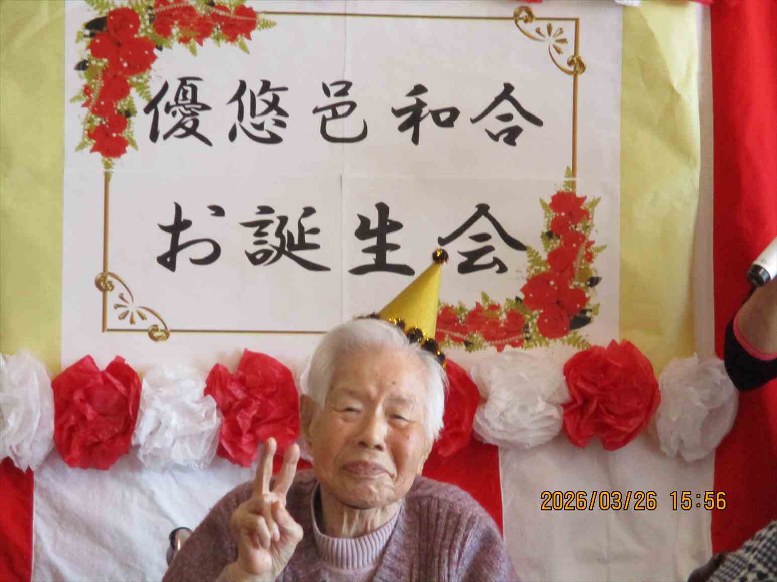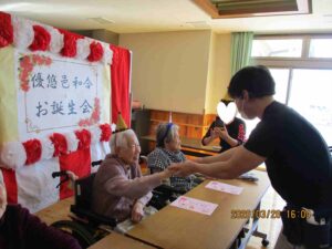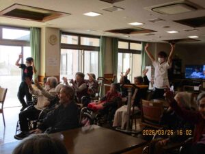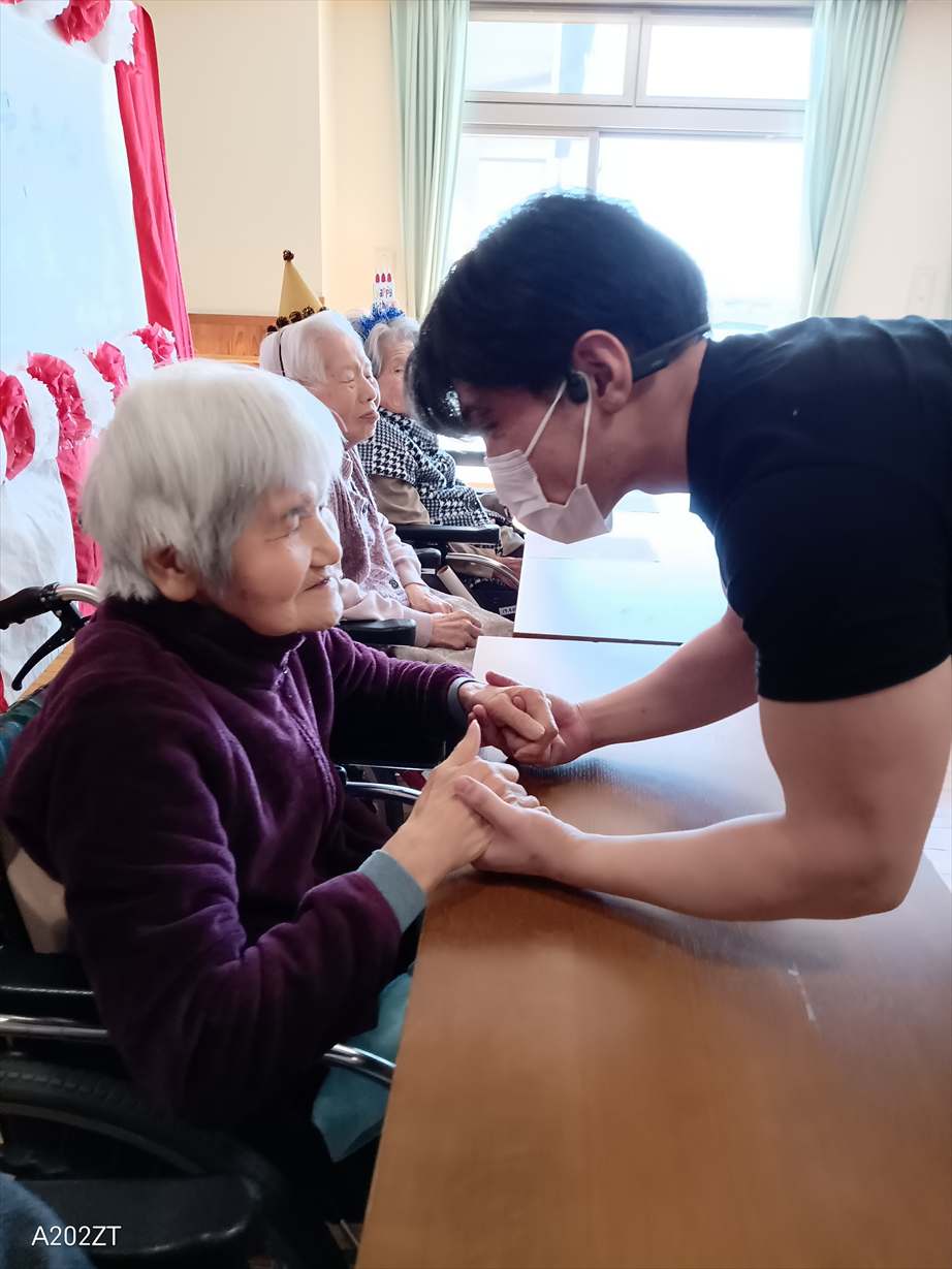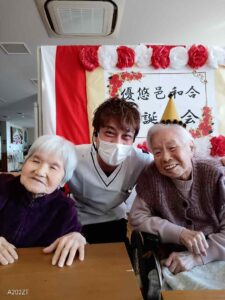 今日の優・悠・邑 和合 2026.3.26 今月のお誕生会 今日は今月のお誕生会がありました。お誕生日の方々はとてもお元気で「お祝いしてくれてありがとう。」と素敵な笑顔で喜ばれていました。 男子職員が熱い思いの握手のプレゼントをしました。 お一人ずつに「ハッピーバースデー」の歌を贈り、フロアの利用者様とお祝いして万歳三唱をしました。 そして、お楽しみの家族会からのケーキのプレゼントです。 今日のケーキは緑とピンクが可愛いい、春を感じるイチゴのモンブランでした。 「とっても美味しいわ。」と皆さんに大好評でした。