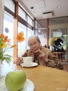 今日の優・悠・邑 和合 2025.9.21 喫茶店 今日は午後から施設の1階にある喫茶店に行きました。 それぞれ好きな飲み物を飲んで、会話が弾みます♪ テーブルには季節のお花が飾ってあり、季節を楽しむこともできました。 皆さん、喫茶店でのティータイムを楽しみにされています。