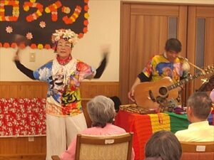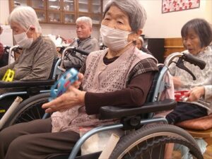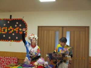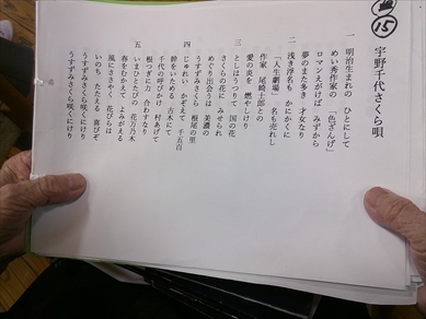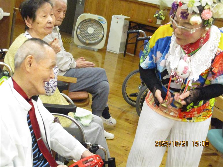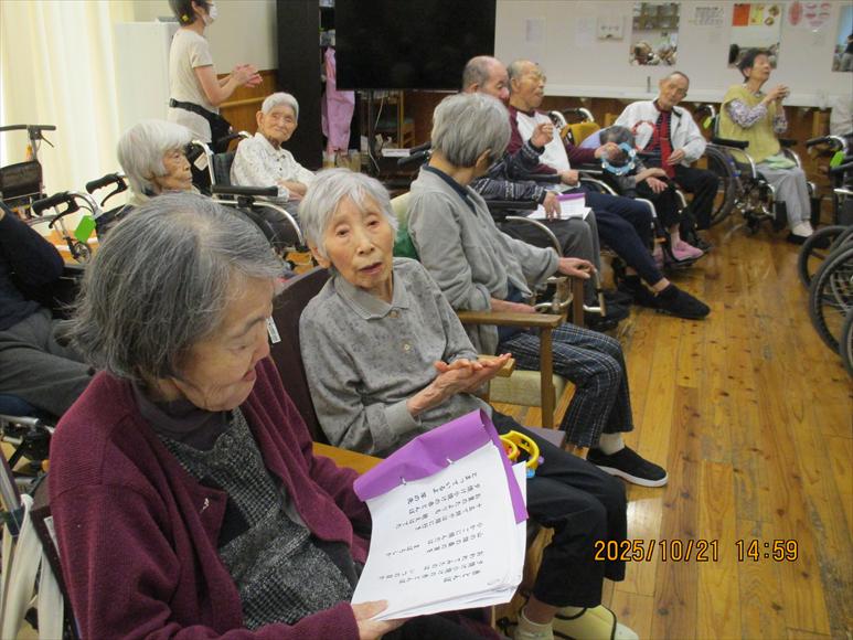 今日の優・悠・邑 和合 2025.10.21 嬉しがり屋 行時&千代和 今日は2か月ぶりの嬉しがり屋 行時&千代和さんが来てくださいました。 歌詞カードを見ながら「野菊」「赤とんぼ」を一緒に歌いました。 千代和さんの18番「薄墨桜」「宇野千代さくら唄」「いつでも夢を」はとても盛り上がり大合唱しました。 最後に10月生まれの方をみんなでお祝いしました。おめでとうございます!