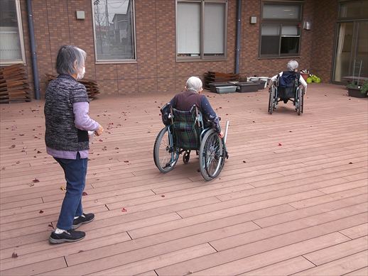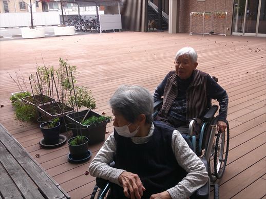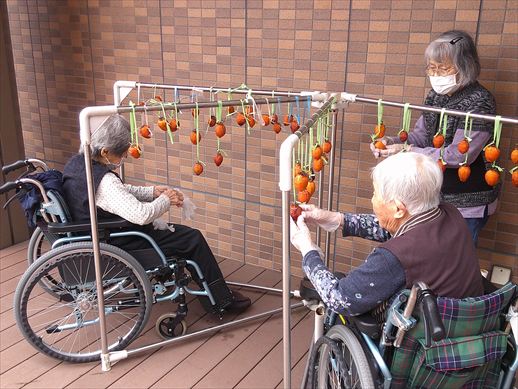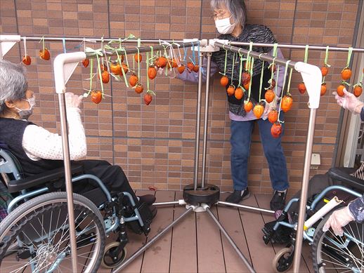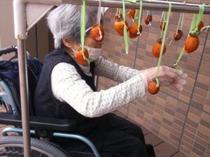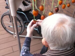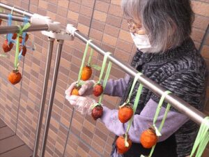 今日の優・悠・邑 和合 2025.11.13 干し柿のお世話 本日は干し柿の様子を見に少し外へ出ました。 利用者様は手袋を装着し、干し柿一つ一つ、やさしく揉んで 「これでおいしくなるでねー。」 とおっしゃっていました。 「私も昔は2階でいつも作ってたよー。」 「干し柿、買うくらい私は好きやよ。」 と干し柿のお世話をしながらいろいろお話してくださいました。 「強くやると、中が飛び出るで気を付けてね。」 と教えてくださいました。 人生の大先輩のお言葉は、いろいろと勉強になります。