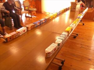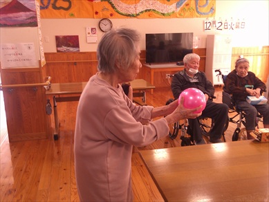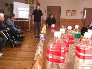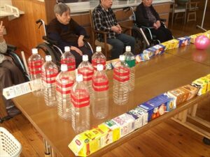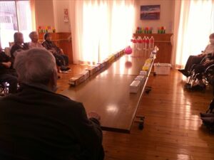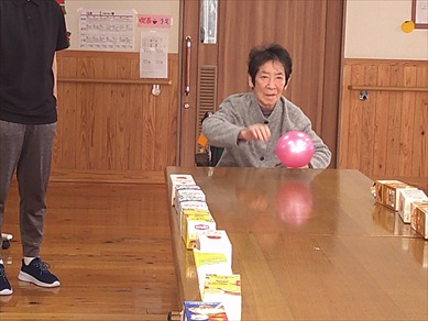 そんな本日のレクリエーションは、壁をつくり、ピンを並べてボーリングをしました。