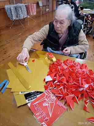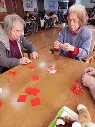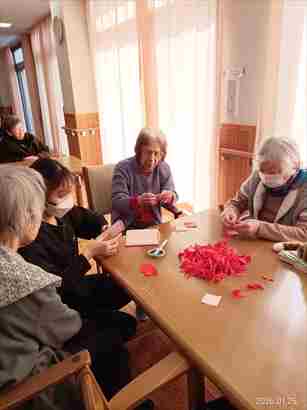 今日の優・悠・邑 和合 2026.1.25 梅の飾り作り 今日の朝、施設の周りは一面の雪景色でした。 テレビのニュースでは全国の大雪の情報が流れ、皆さん心配そうに聴いておられました。 その後、あれ!あれ!お日様が出てきてとてもいい天気になり雪が見る見る溶けていきいきます。 皆さんで「よかったね。」「これぐらいですんでね。」と安心しました。 午後のレクは梅の花の飾りつくりをしました。 細かな折り目を一所懸命にされて「夢中になると時間が経つのが早いわ。」と満足気なお顔です。 もうすぐフロアに紅白の梅がたくさん咲きます!楽しみですね!