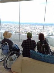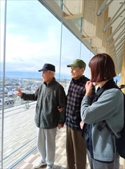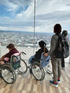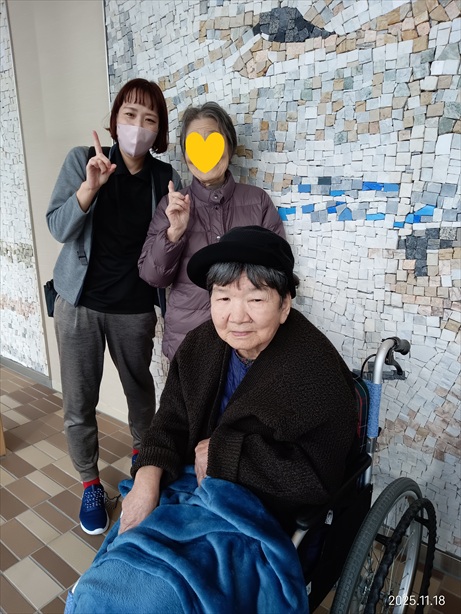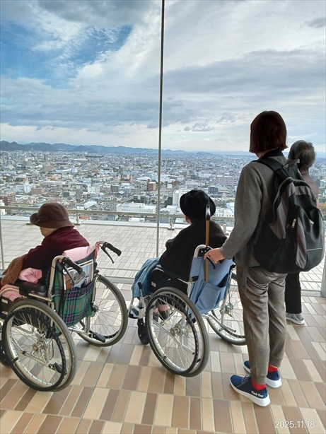 今日の優・悠・邑 和合 2025.11.18 県庁展望室外出2日目 今日は少し肌寒いのでしっかりと防寒して県庁展望室に外出しました。 到着すると立派な建物を見て「すごいね!これが新しい県庁か、来れて良かったわ。」 と少し緊張気味な笑顔です。 20階まであっという間に上がり、そこには絶景の景色がありました。 「わー。」「いい景色やな。」「これはすごいわ!」と歓声が上がりました。 遠くは名古屋のビル群まで見えて、広々とした展望室は心地よい時間でした。 県庁前の紅葉も見ごろで綺麗でした。 251118111653421 秋のひと時を外出で楽しんでいただけて良かったです。