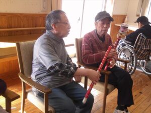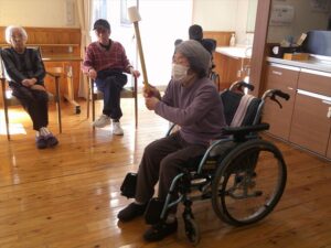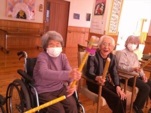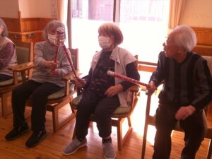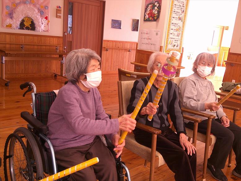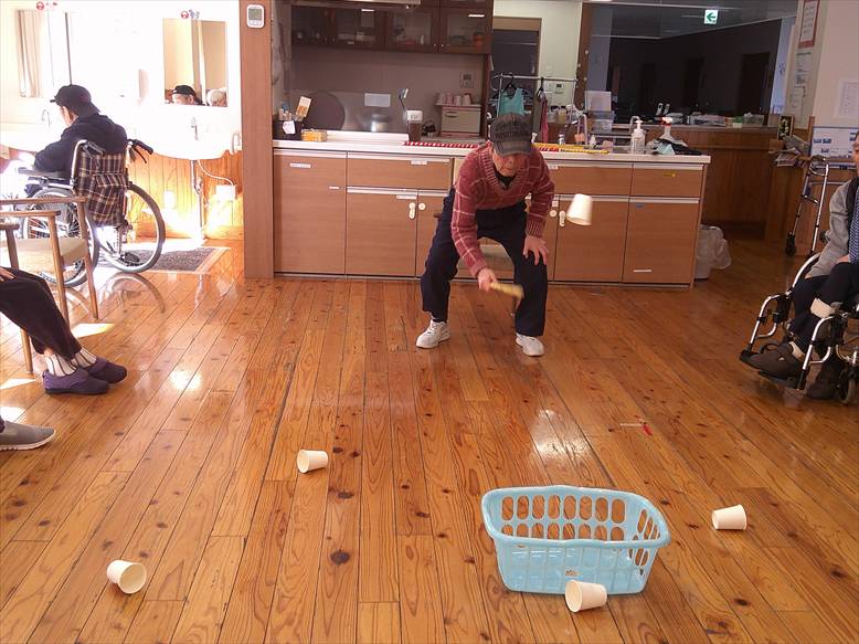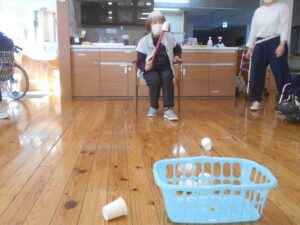 今日の優・悠・邑 和合 2026.2.28 紙コップでゲーム 今日は冷たい風が吹いていましたが、暖かい陽差しがあり屋内はとても過ごしやすい日となりました。 午後からのレクリエーションは棒と紙コップを使ったゲームを行いました。 紙コップを隣の人に渡していくリレー。チーム対抗で行って大変盛り上がりました。 コップ渡しの後はコップ投げです。 ケースに入ると「お~!」という声と拍手がおこって、なかなか楽しい時間となりました。 明日から3月。 来月も色々な行事やレクリエーションが計画されています。楽しみですね(^^)