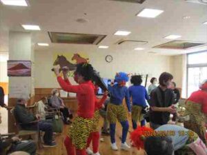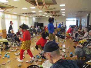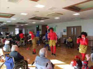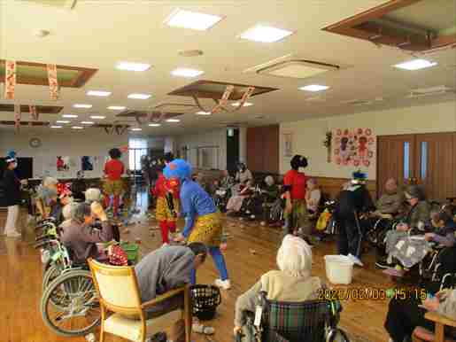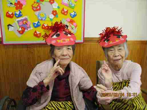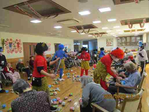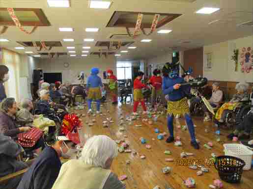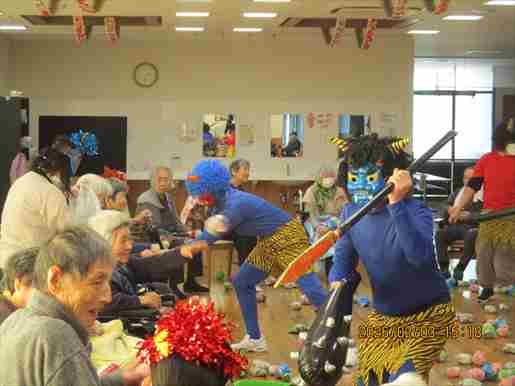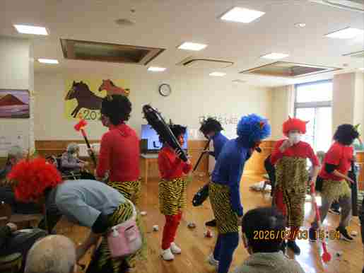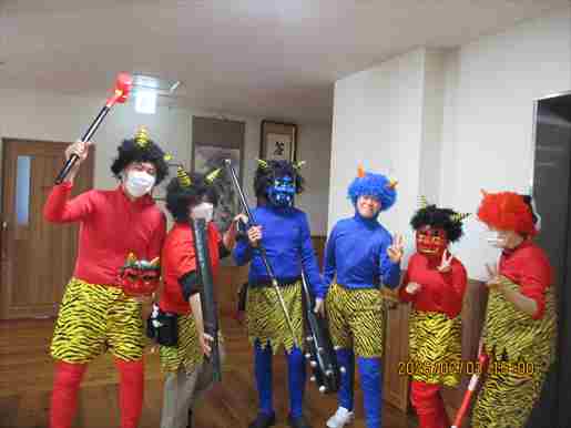 今日の優・悠・邑 和合 2026.2.4 豆まき 鬼退治2 昨日は1階でしたが、今日は2階と3階で行われた豆まきの報告をします。 皆さんで大きな輪になってやってきた鬼たちの退治をしました。 「鬼にあてた分だけ厄が逃げていきますよ。」と職員の声掛けで皆さん頑張って 豆を投げて下さり盛り上がりました。 「鬼は外、服は着てます。」と利用者様の洒落っ気のある掛け声に鬼が一斉にずっこけていました。 実習に来ておられる看護学生さんも参加してくださり、鬼になったり周りで盛り上げて下さったりとても楽しい時間が過ごせました。 利用者様が「鬼可愛いね、私もなりたい。」と言われたので、皆さんで鬼になりました。