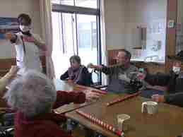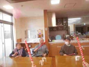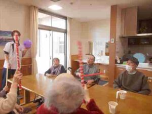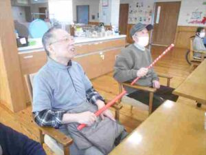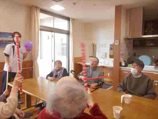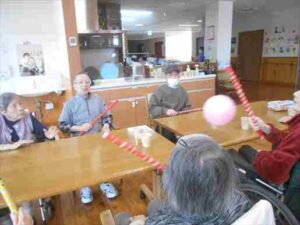 今日の優・悠・邑 和合 2026.1.16 風船バレー 今日は1階の利用者様はOTと一緒に風船バレーを行いました。 最初は一生懸命に先生の説明を聞いて、「はい。はい。分かりました」 とルールを把握できそうな様子でした。 運動する前に「グー。ぱー」手を起動して、体を温め、 歩ける方と車椅子を使用する方と共に棒を使って、風船が落ちないように。 利用者様たくさん笑って、活気に運動しました。 「いい運動ですね」「もう疲れたわ」と利用者様が嬉しそうに言ってみえました。