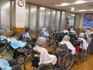 今日の優・悠・邑 和合 2025.10.27 健康診断 今日は午後から利用者様の健康診断がありました。 レースやボタンの着いた下着は検診ではダメなので全員シンプルな下着を着用して検診しました。順番を待つ間は少し緊張され真剣な表情です。 でもお隣同士で会話が始まると和やかな雰囲気になり笑顔も見られました。 皆さん毎日お元気で過ごされていますが、健康診断は大切です。 検診が終わり職員の「お疲れさまでした。」の声掛けに「ありがとね。」と言われ、ほっとされたのか美味しそうにおやつを召し上がられました。