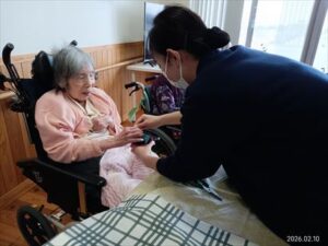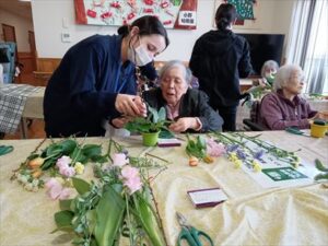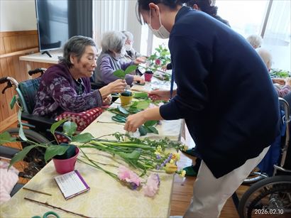 今日の優・悠・邑 和合 2026.2.10 フラワーアレンジメント TEARさんのご協力のもとフラワーアレジメントを行いました。 看護学生と入居者様一緒にどこに刺しこんだら綺麗に見えるか、花をにらめっこしながら完成されていました。